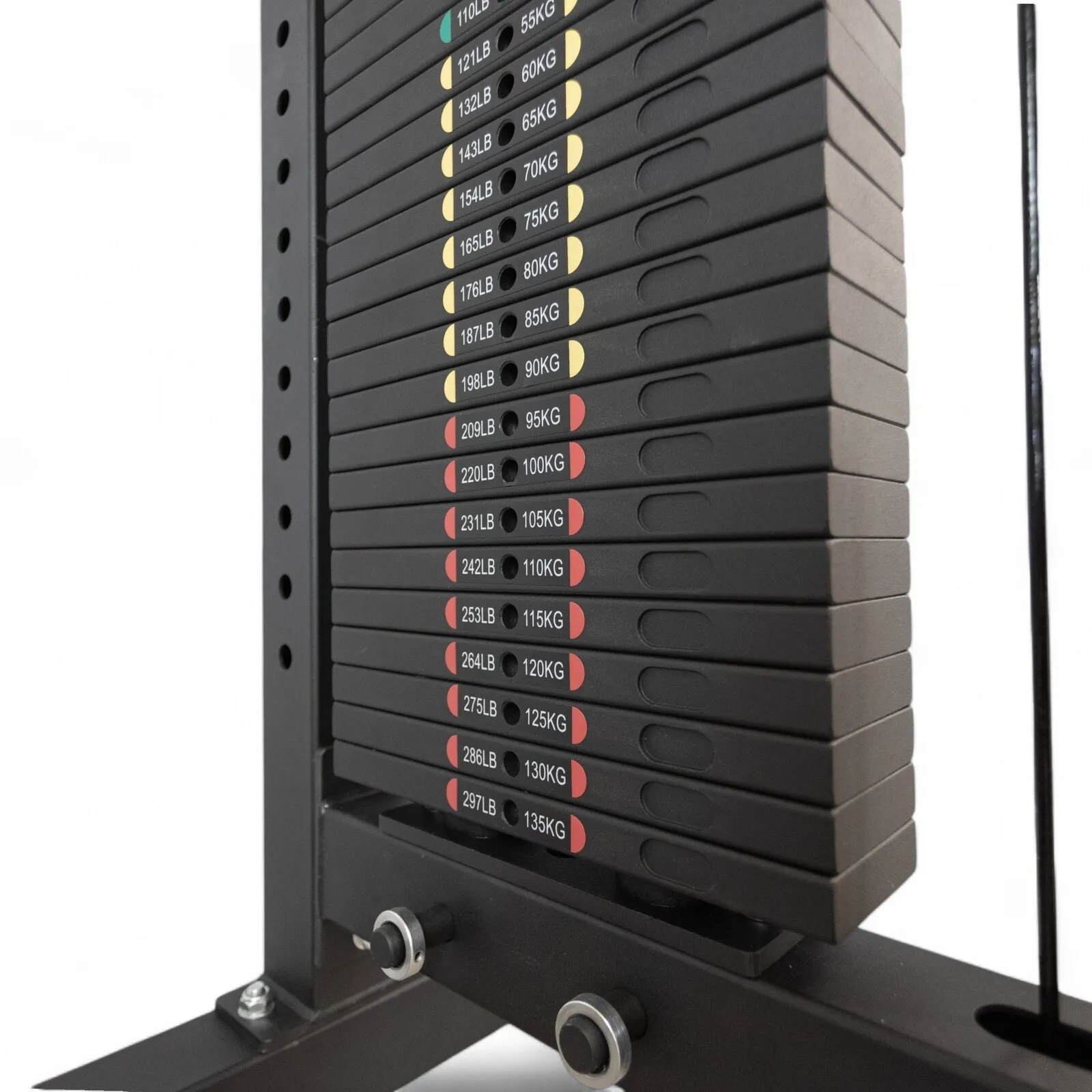 - Features a 300-pound single-weight stack, adjustable in 10-pound increments