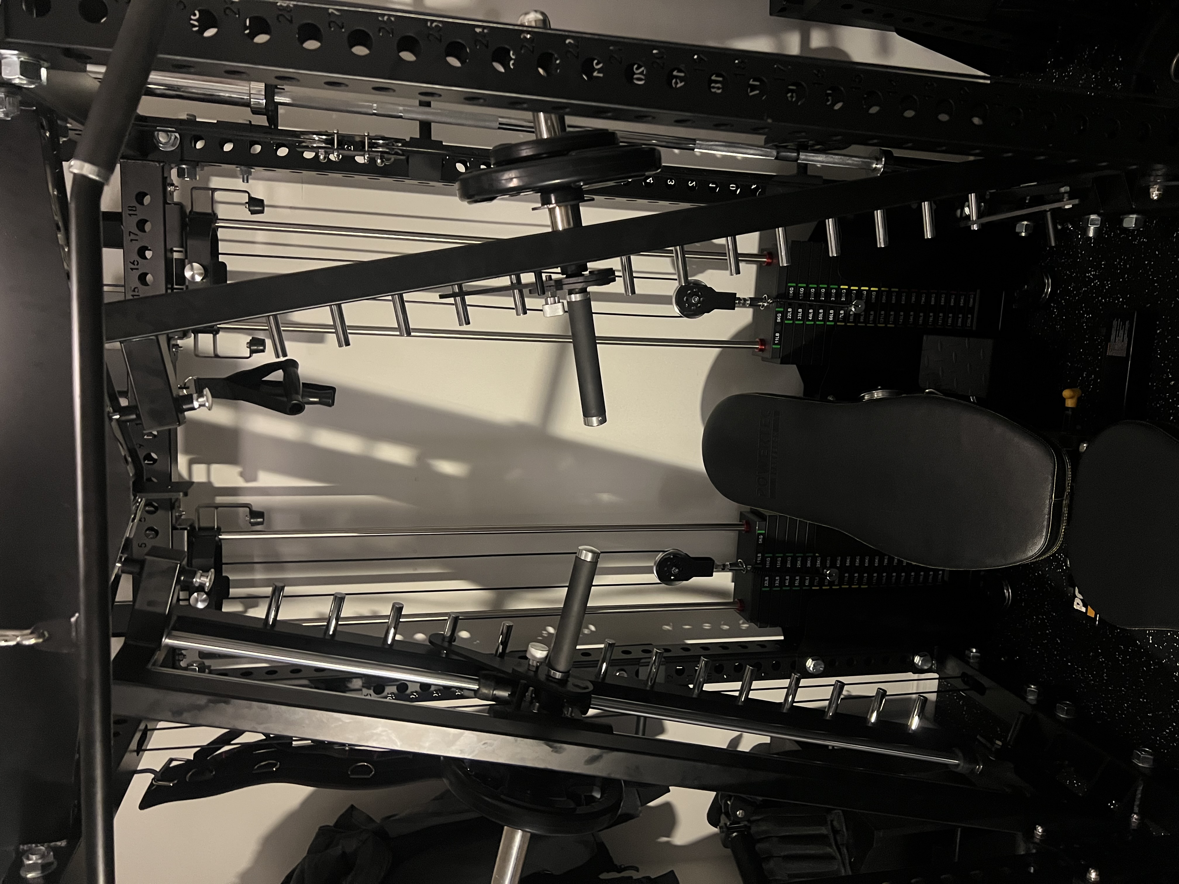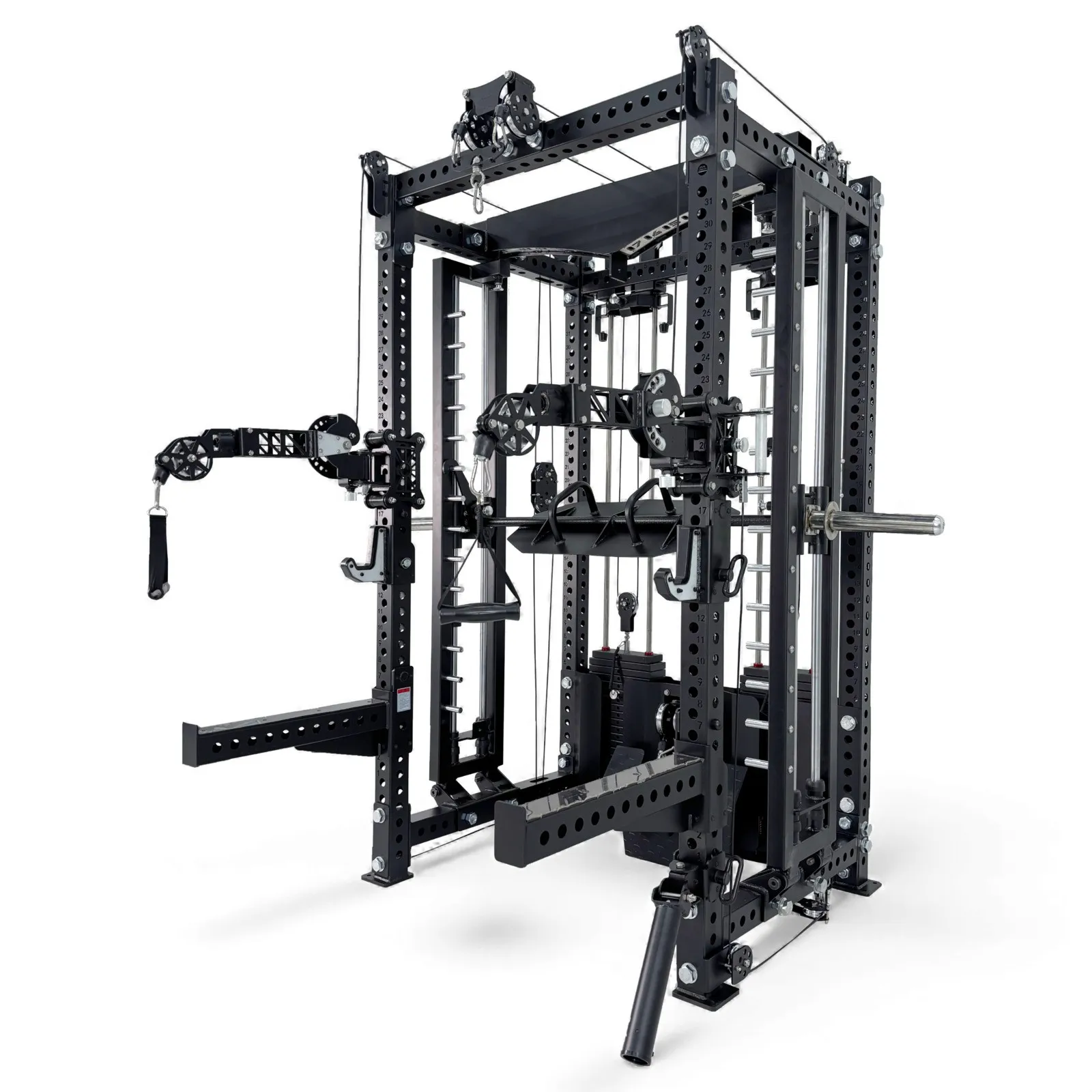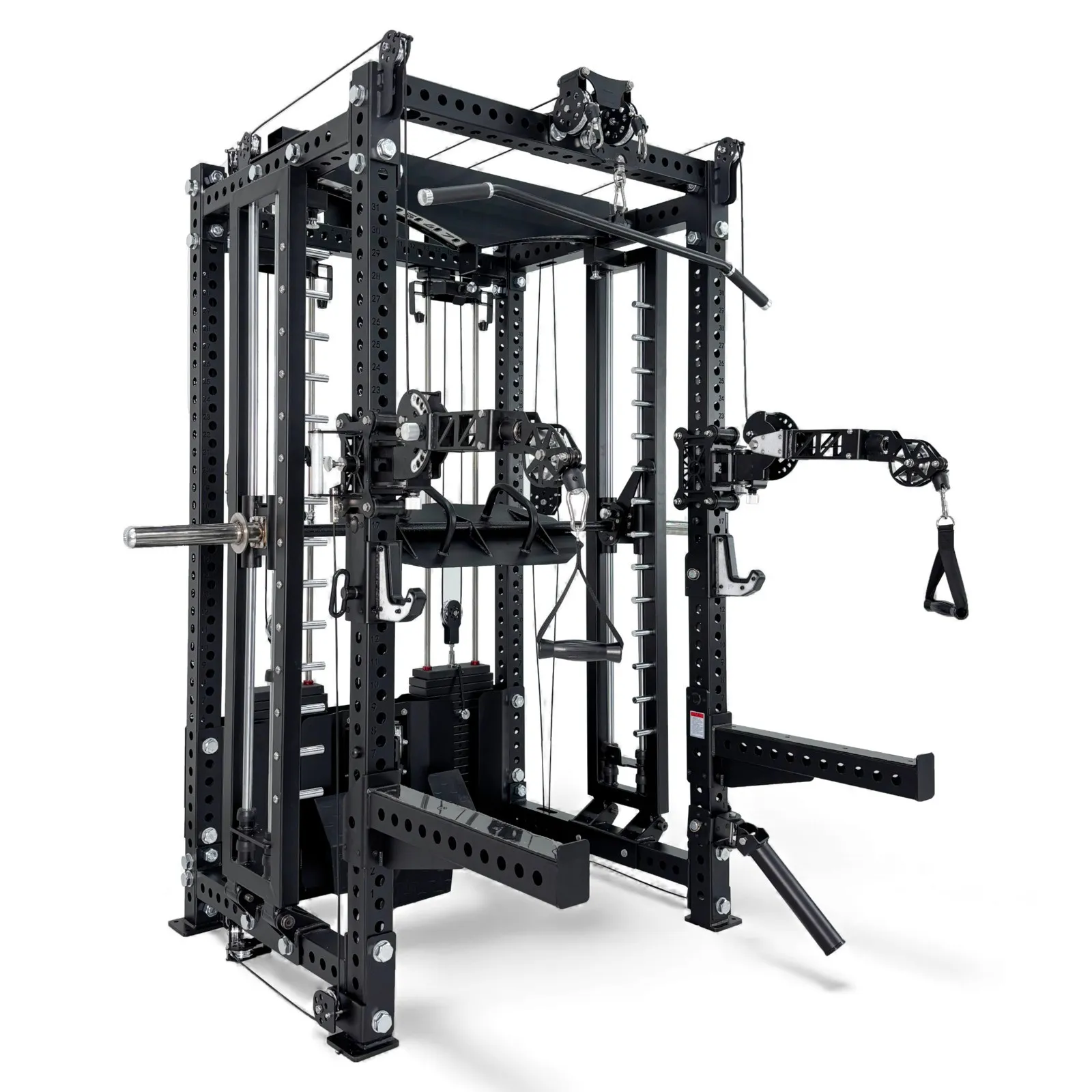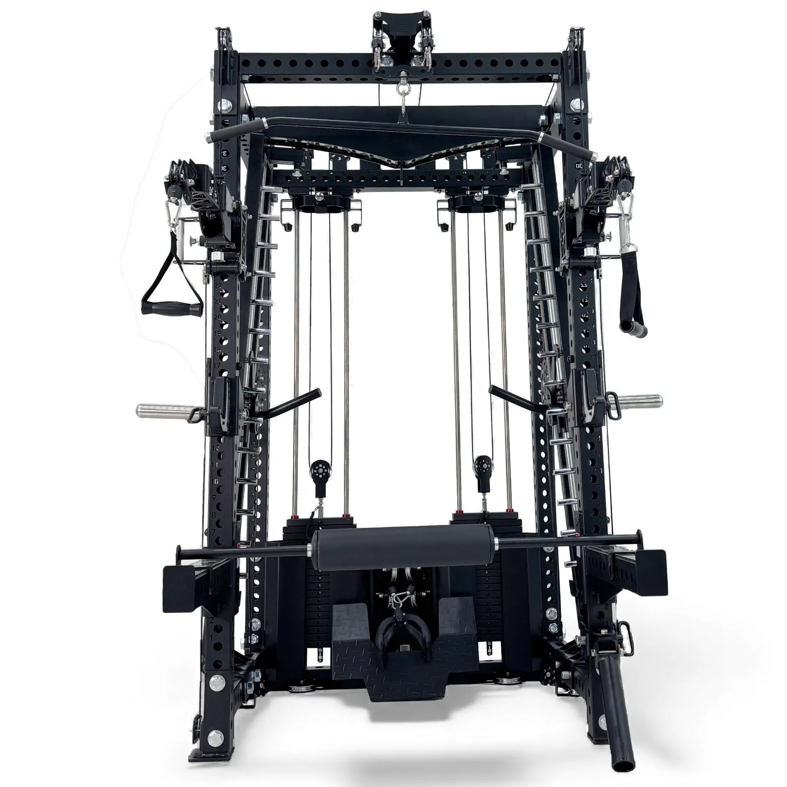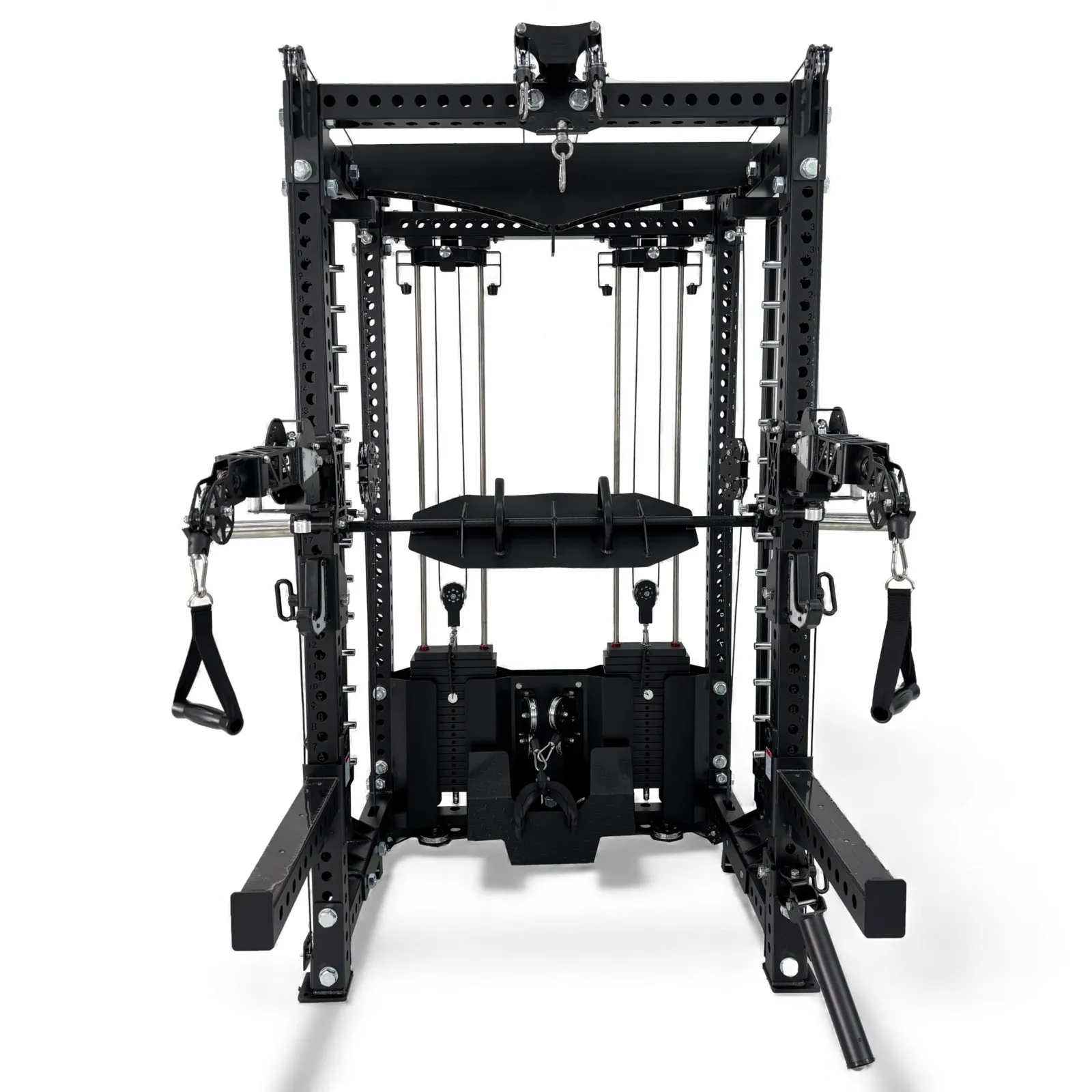 - Half Rack Functionality – Integrated J-hooks, spotter arms, and bar storage allow traditional barbell training.